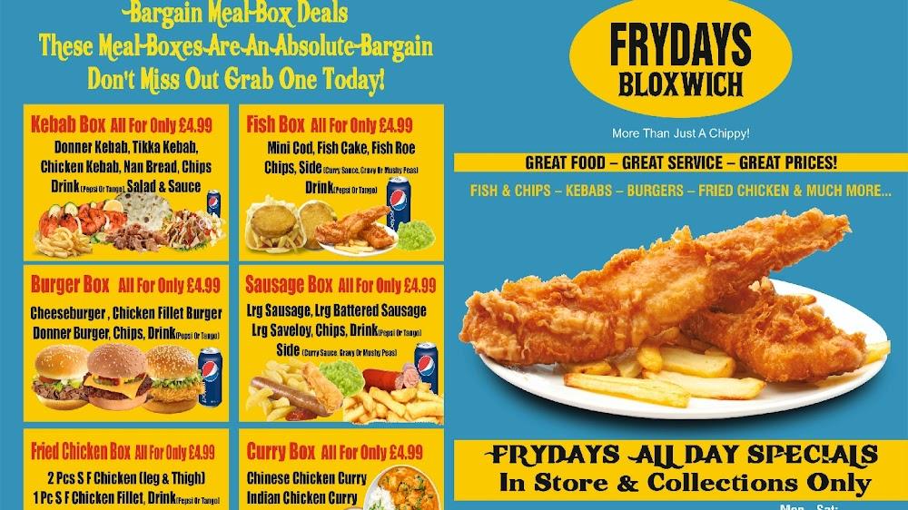 Situated at 51 Well Lane, Bloxwich, in Walsall, Frydays Fish and Chips is a beloved local joint. This restaurant caters to a diverse clientele, making it a popular stop for families and individuals alike. The relaxed atmosphere radiates casual charm, perfect for enjoying a quick meal with friends or taking the family out for lunch. The establishment prides itself on the use of fresh ingredients and quick service, with food prepared right before your eyes. With options like kebabs, burgers, and, of course, classic fish and chips, there's something to please every palate. Conveniently accepting phone orders allows for easy pickup or delivery—ideal for those busy evenings when cooking might feel like a chore. Plus, free street parking nearby means it's easy to swing by anytime. Whether you're local or just passing through, Frydays stands as a solid choice for a bite to eat.